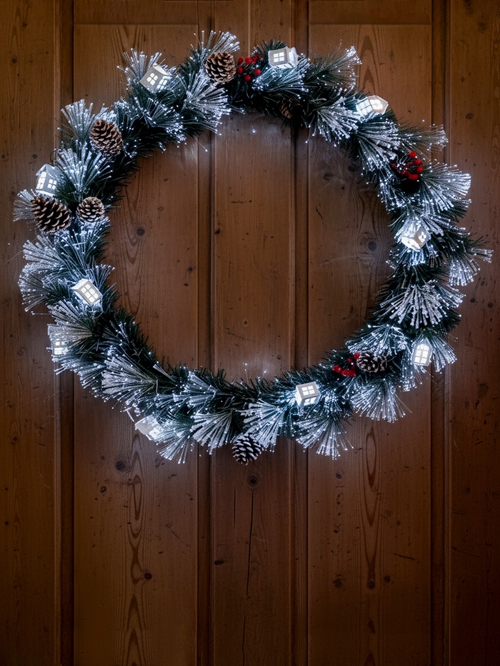 Фиброоптическая гирлянда длиной 200 см создаёт эффект снежного зимнего леса в вашем доме. Отгибающиеся ветки из ПВХ украшены шишками, ягодами и другими элементами декора, а встроенная подсветка белого цвета с восемью режимами работы оживляет интерьер, добавляя праздничного сияния и уюта.