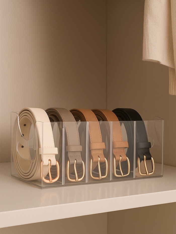 Органайзер для ремней на пять мест представляет собой функциональное решение для аккуратного хранения аксессуаров, значительно упрощая поддержание порядка в шкафу. Прозрачный пластик становится практичным и стильным акцентом, который позволяет быстро найти нужный ремень без лишних усилий.